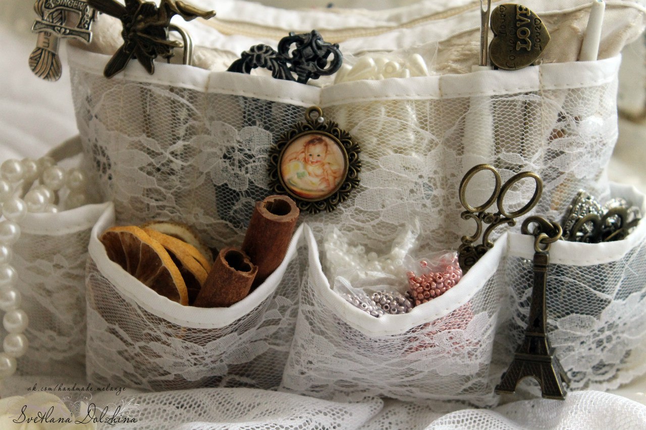 Наступил последний этап в нашем СП "Кружевное настроение" в блоге Скрапволшебница и это-альтер-скрап. Для него я сшила корзинку-мешочек для хранения кружев, в нем также можно хранить пряжу и многое другое. Я влюбилась в прозрачные кармашки в органайзерах и добавила их в мою корзинку. Очень удобно в них хранить всякие нужности))
